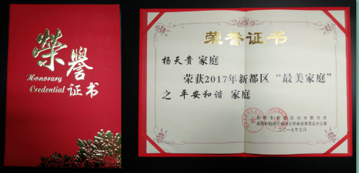 俗話說:忠厚傳家遠,家和萬事興。在西南石油大學社區,提起居民楊天貴一家,那是人人羨慕的和諧安定之家,家庭和睦,兒女盡孝,受到全社區居民的一致好評。楊天貴老師在1934年加入中國工農紅軍第四方面軍,走過二萬五千里長征,后參與抗日戰爭、解放戰爭和抗美援朝戰爭,獲得了不計其數的獎章,碩果累累。現年97歲高齡的老人身體依然很硬朗,時常在家里鍛煉身體,在家庭生活中,他們家庭成員處處以禮相待,以誠相待,彼此寬容體諒,互相體貼關心;在對待鄰里關系上,他們全家人都一直堅持著“鄰里關系親如弟兄,情同手足”的理念,鄰居家只要誰有了困難,他們知道的,就一定會伸出友愛之手,主動去幫助大家,為大家排憂解難;他們平時崇尚文明、嚴于律己、寬于待人、講責任講義務,培養良好的家風,因此,形成了一個溫馨、快樂、和諧、奉獻社會的幸福家庭,夫妻敬業愛崗事業有成,老人安享晚年快樂生活、孩子認真學習健康成長。
