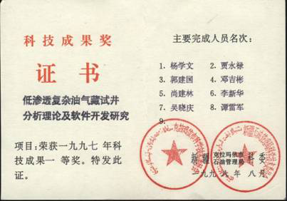 賈:“現代試井分析軟件系統研究”是由原石油部科技司組織的部級項目,組織了4所高校、3個大油田參加。4所高校是北京石油學院、西南石油學院、大慶石油學院和中國科技大學。3大油田是大慶油田、中原油田和四川油氣田。該項目于1984年底啟動,1985年正式開工,1987年通過最終驗收,1988年通過1年推廣應用,1989年獲中國石油天然氣總公司科技進步一等獎,1990年獲國家科技進步三等獎。
