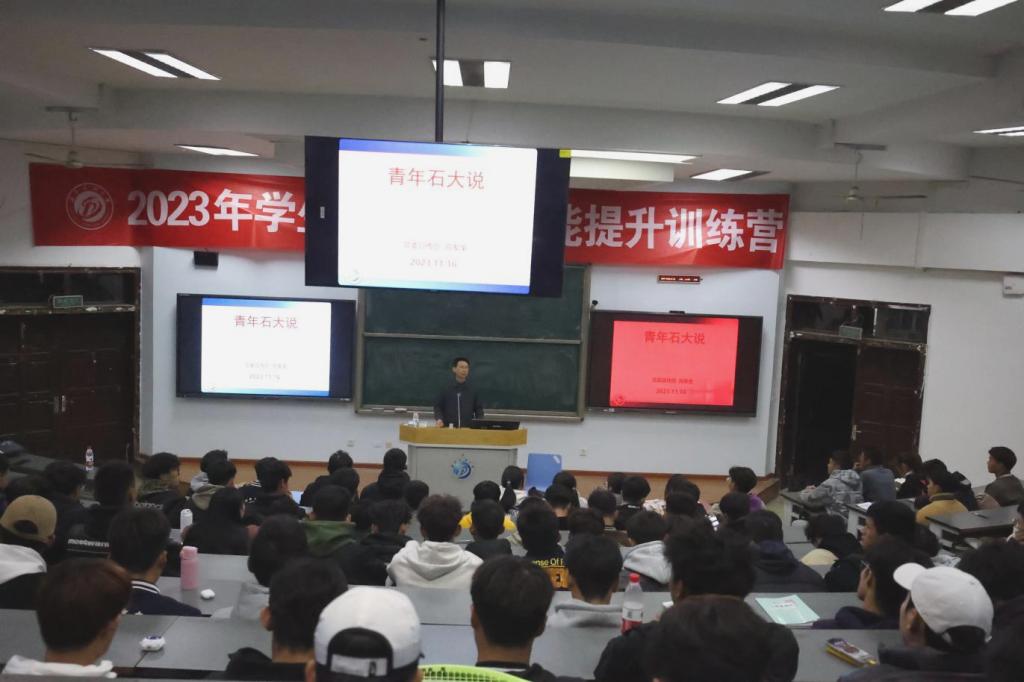 講座中,向發(fā)全從學(xué)校成立的背景與歷史變革、歷代石大青年的典型故事,通過圖片和事例等方式,生動詳細講解了學(xué)校建校之初的非常規(guī)辦學(xué)到如今的“雙一流”內(nèi)涵式高質(zhì)量發(fā)展,慷慨激昂地描繪了張永一、李世倫、羅平亞等前輩們孜孜求學(xué)“為石油而生、為石油而息”的興油報國愿景,以及展現(xiàn)了近幾年涌現(xiàn)出的劉宸、李凱等人的先進事跡。