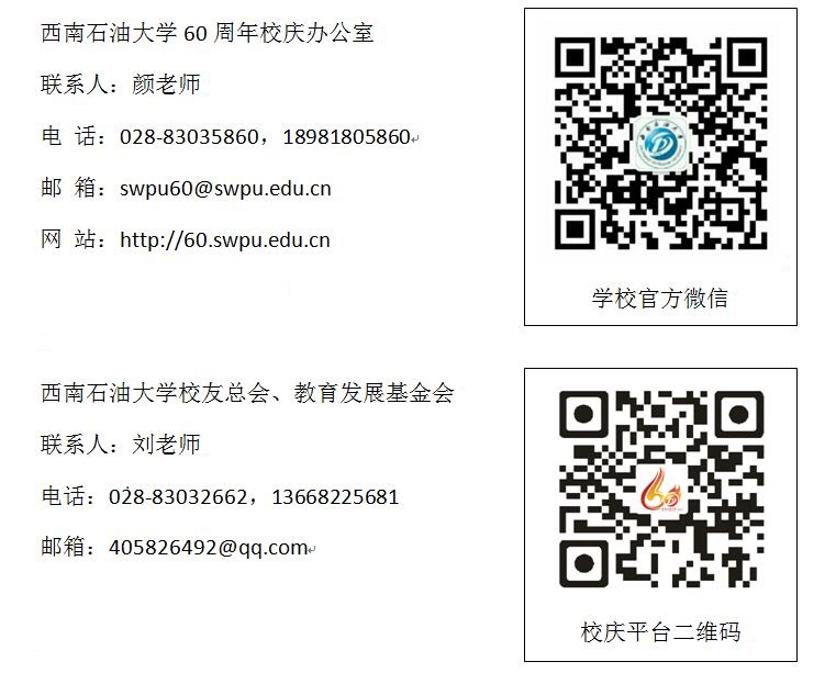 我們熱忱歡迎廣大校友和各界朋友以不同形式參與和支持學(xué)校60周年校慶。誠摯邀請長期以來關(guān)心和支持學(xué)校發(fā)展的各級領(lǐng)導(dǎo)、海內(nèi)外校友、社會各界朋友相聚西南石油大學(xué),暢敘情誼,同慶華誕, 共商發(fā)展。