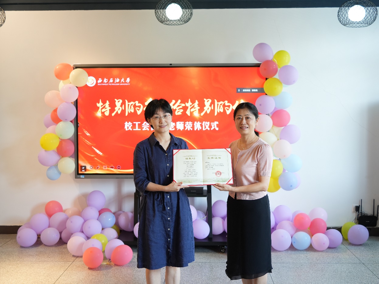 “自童蒙,父輩傳承,石大為家;至精誠,崗位砥礪,英姿勃發……若將歲月開成花,人生何處不芳華。” 牟卿致榮休致敬詞并為曹軍頒發榮休證書,感謝曹老師為學校,特別是工會工作的建設與發展做出的重要貢獻,祝福曹老師退休生活開心愉悅、幸福常在。