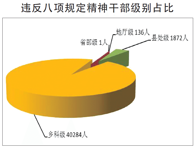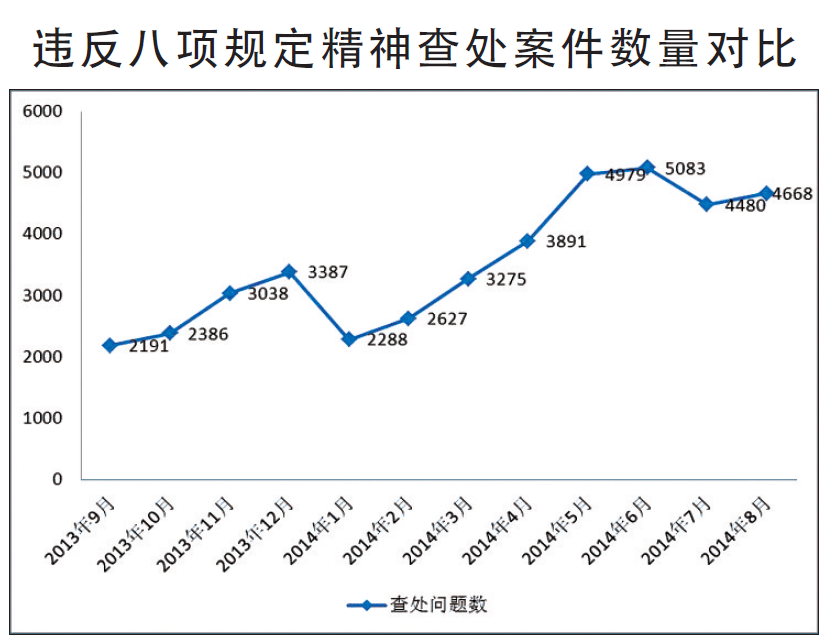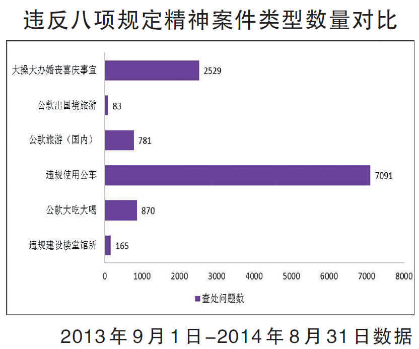 背景分析:2013年9月起,中央紀委監察部實行全國查處違反中央八項規定精神問題每月通報制度。據統計,一年來,案件數量呈現逐步上升的態勢。這一方面反映出各地各部門對違反中央八項規定精神問題的常抓不懈、查處力度不斷加大;另一方面,也說明少數黨員領導干部無視規定、頂風違紀的現象依然存在。在查處的案件中,鄉科級干部比例達95%,成為違規的主體,而縣處級、地廳級、省部級人數依次減少。同時,違規使用公車、大操大辦婚喪喜慶事宜、公款大吃大喝等問題較為突出。
