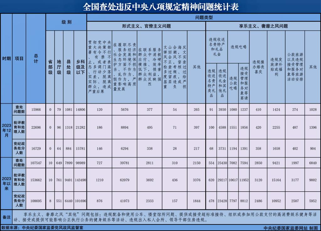 數(shù)據(jù)顯示,2023年,全國共查處違反中央八項規(guī)定精神問題107547起,批評教育和處理153662人,其中黨紀政務(wù)處分108695人。