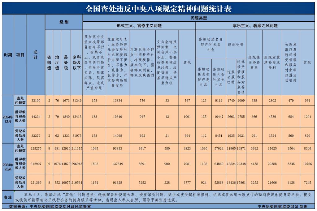 數據顯示,2024年,全國共查處違反中央八項規定精神問題225275起,批評教育和處理312907人,其中黨紀政務處分221369人。