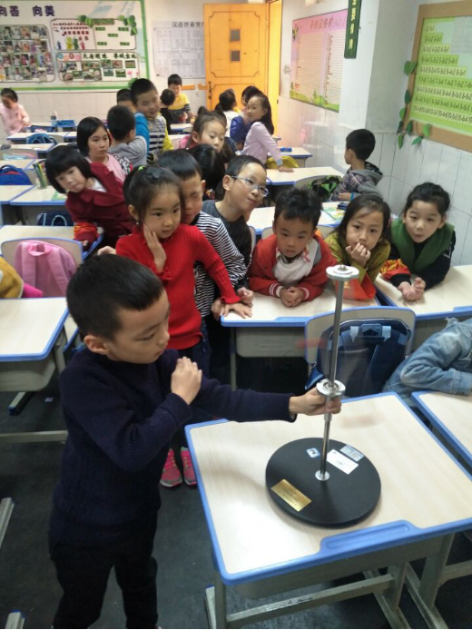 利用魚洗和共振演示來說明共振是指一物理系統(tǒng)在共振頻率特定頻率下,比其他頻率以更大的振幅做振動的現(xiàn)象。通過共振現(xiàn)象的講解,讓小朋友知道當步伐震動頻率跟樓梯振幅越接近,樓梯越危險。為了說明人體本來就是導體,當人體接觸帶電體或者接觸電源而形成回路就回導電,我們準備了人體導電測試儀器和閃電球。通過角動量守恒演示,給同學們展示了滑冰運動員可以通過手臂的位置來控制轉(zhuǎn)動的速度等等有趣的物理小知識。