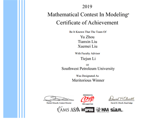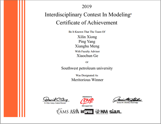 近日,2019年美國大學(xué)生數(shù)學(xué)建模競賽和交叉學(xué)科建模競賽(MCM/ICM)成績揭曉,我校參賽隊(duì)喜獲3項(xiàng)一等獎(jiǎng)(Meritorious Winner)、2項(xiàng)二等獎(jiǎng)(Honorable Mention)。
