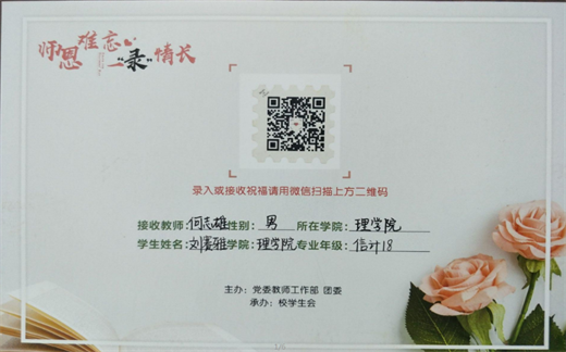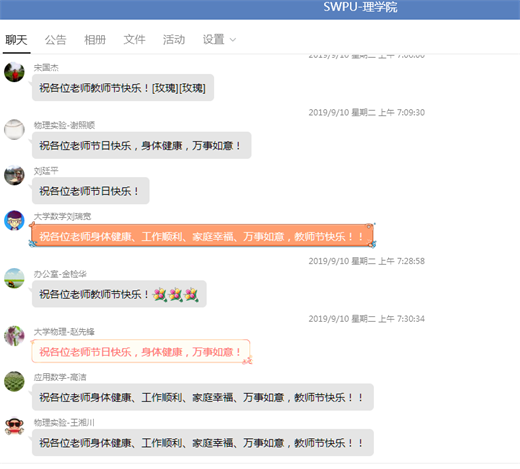 “祝老師們節(jié)日快樂,家庭幸福!”一大早,學(xué)院的QQ群就熱鬧非凡,學(xué)院領(lǐng)導(dǎo)首先發(fā)起對(duì)老師們節(jié)日的祝福。老師們也自發(fā)開啟了互相祝福的暖心模式。同時(shí),微信也被學(xué)生們飽含敬意的留言霸屏。一波波暖心的祝福,匯聚成一股股暖流,溫潤著每一位老師的心田。