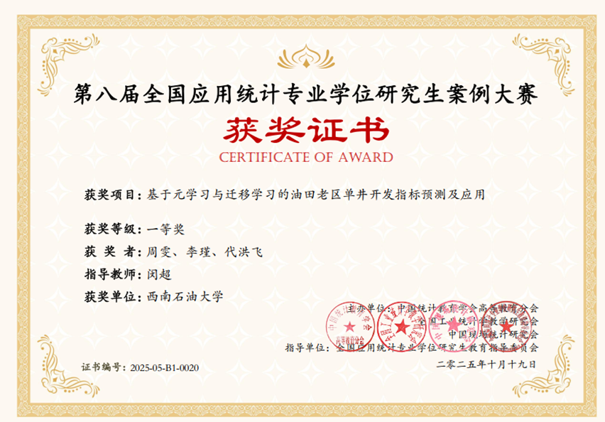 我院研究生周雯、李瑾、代洪飛三位同學共同完成的案例作品“基于元學習與遷移學習的油田老區單井開發指標預測及應用”榮獲全國一等獎,入選“全國應用統計專業學位教育教學案例庫”。