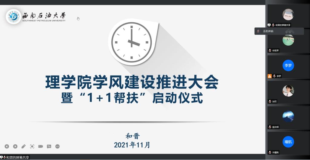 為進一步提升學(xué)院人才培養(yǎng)質(zhì)量,深化、強化、細化學(xué)風(fēng)建設(shè),營造良好的學(xué)習(xí)氛圍,理學(xué)院于2021年11月10日晚7點在線上騰訊會議召開了理學(xué)院學(xué)風(fēng)建設(shè)推進大會暨‘1+1幫扶’啟動儀式。信息與計算科學(xué)專業(yè)2020級班主任任俊杰、數(shù)學(xué)與應(yīng)用數(shù)學(xué)專業(yè)2020級班主任劉瑞寬、輔導(dǎo)員和晉、李夢及全體結(jié)對幫扶同學(xué)參加會議,會議由和晉主持。