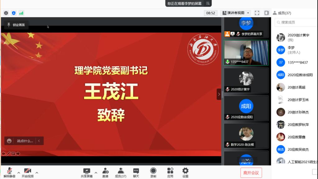 11月15日晚7時,理學院通過騰訊會議在線上舉行了第三期“青年馬克思主義者培養工程”開班儀式暨第一次團課,理學院黨委副書記王茂江、團委副書記伍悅、2020級輔導員李夢、2021級輔導員張慧玲及全體學員參與此次會議,會議由李夢主持,王茂江為青馬工程培訓班學員講授第一次團課。