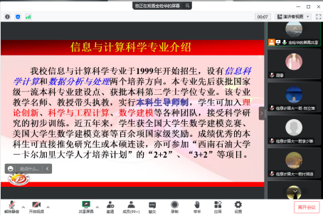 9月23日,四名優(yōu)秀畢業(yè)校友、高年級學(xué)長學(xué)姐與新同學(xué)們線上屏對屏,開展了“學(xué)長學(xué)姐領(lǐng)航計劃”交流分享會,2022屆信息計算專業(yè)畢業(yè)生段貿(mào)騰就專業(yè)學(xué)習(xí)與考研推免與同學(xué)們進行了分享,劉賽雅就精彩紛呈的大學(xué)經(jīng)歷與學(xué)弟學(xué)妹們共勉,2019級應(yīng)用數(shù)學(xué)專業(yè)徐佳就如何平衡學(xué)習(xí)與學(xué)生工作交流了心得體會,2021級人工智能專業(yè)楊小凈就學(xué)科競賽向?qū)W弟學(xué)妹們分享了經(jīng)驗與感悟。