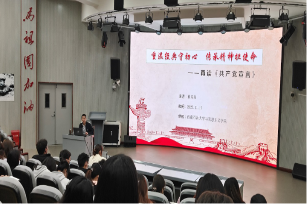 “不忘初心、牢記使命”,崔發展用循序漸進的方式講述了為什么要不忘初心、牢記使命以及怎樣才能守初心、擔使命,并帶領同學們一同尋源《共產黨宣言》。崔發展從《共產黨宣言》的歷史背景、主要內容、我國的傳播情況及和時代價值等方面作了論述與講解,向同學們展示了《共產黨宣言》誕生的來之不易與其意義非凡的歷史價值,與同學們一同體會中國共產黨發展至今所擁有成就背后的艱辛。“筑牢信仰之基,補足精神之鈣,把穩思想之舵”。講座最后,崔發展指出了作為一名黨員所需堅信的明路,給學員們的思想注入了新生的力量、堅守自我的初心、承擔應盡的使命。