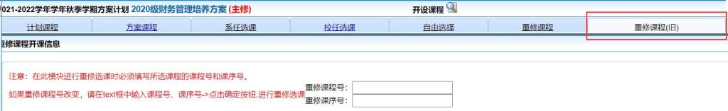 第一步:登錄教務系統,依次點擊導航條中的【選課管理】→【網上選課】,選擇培養方案,然后點擊【重修選課(舊)】,進入重修選課頁面。