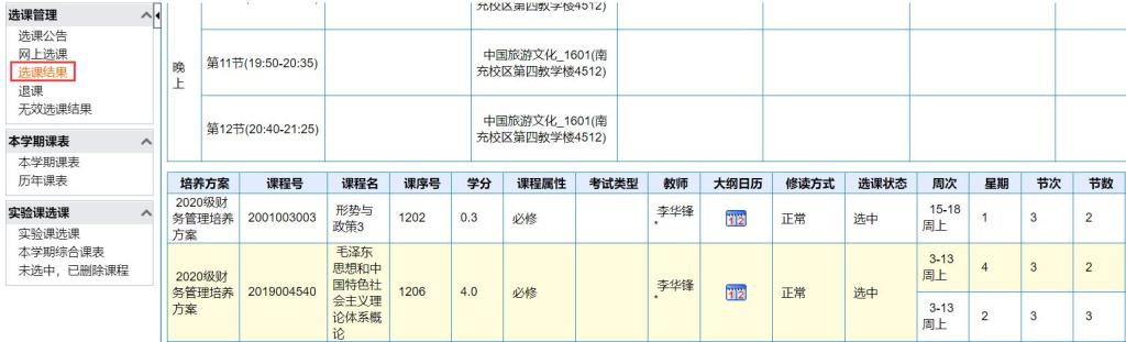 第三步:選課完成后可在【選課結果】中查詢所選課程,所選重修課程網上報名成功。