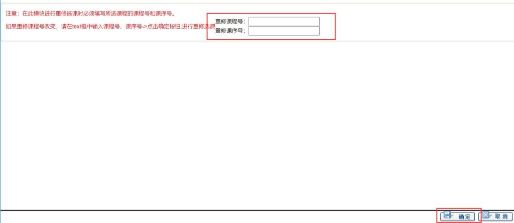第二步:在《2021年秋季學期開設課程清單》(見附件1)查詢出需重修課程的課程號和課序號,在重修選課頁面輸入該課程的課程號及課序號(注意:輸入課程號時會提示“你選擇的課程不是您所在方案的課程是否繼續”,點擊確定,繼續輸入課序號),點擊確定,此時出現如下頁面: