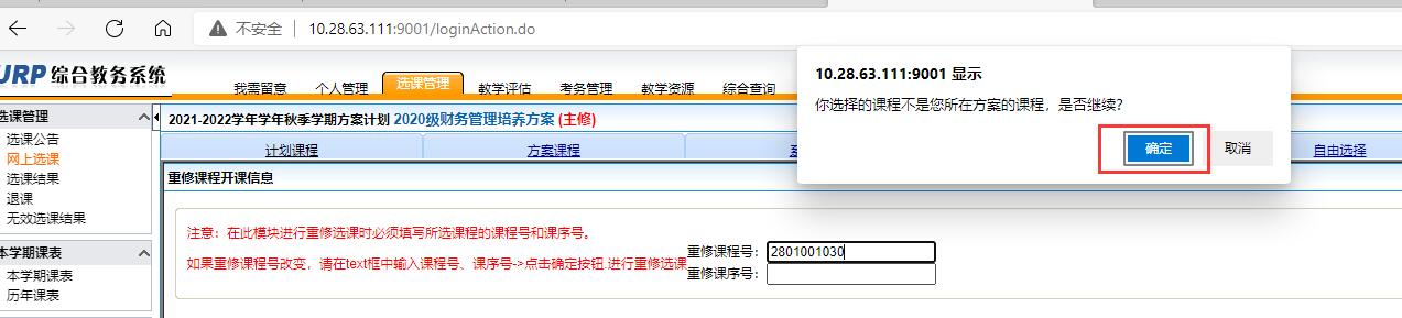 第二步:在《2021年秋季學(xué)期組班重修(補(bǔ)修)課程表》(見附件)查詢出需重修課程的課程號和課序號,在重修選課頁面輸入該課程的課程號及課序號(注意:輸入課程號時(shí)會提示“你選擇的課程不是您所在方案的課程是否繼續(xù)”,點(diǎn)擊確定,繼續(xù)輸入課序號),點(diǎn)擊確定,此時(shí)出現(xiàn)如下頁面: