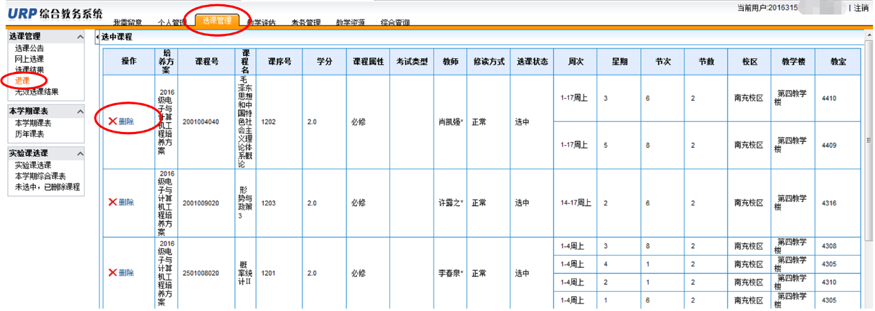 3、補(bǔ)退選若學(xué)生有漏選、錯選課程的,請?jiān)谘a(bǔ)退選階段登錄教務(wù)系統(tǒng)進(jìn)行補(bǔ)退選。補(bǔ)選課程的操作步驟參照正選階段選課操作步驟進(jìn)行。若需退選課程,點(diǎn)擊【退課】按鈕,進(jìn)入頁面后點(diǎn)擊課程最前一列【刪除】按鈕退課。