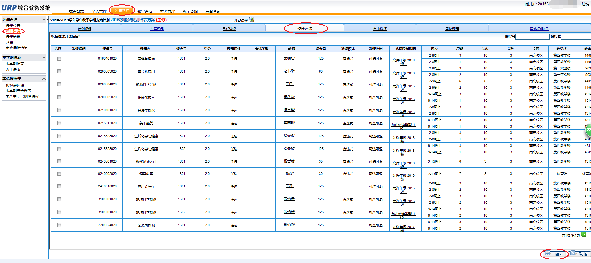 校內網登錄教務系統,網址為:http://10.28.63.116:8081/(若使用外網,請使用VPN登錄)。依次點擊導航條中的【選課管理】→【網上選課】,選擇培養方案,然后點擊【校任選課】,進入文化素質課程選課頁面,選擇課程點擊確定即可。