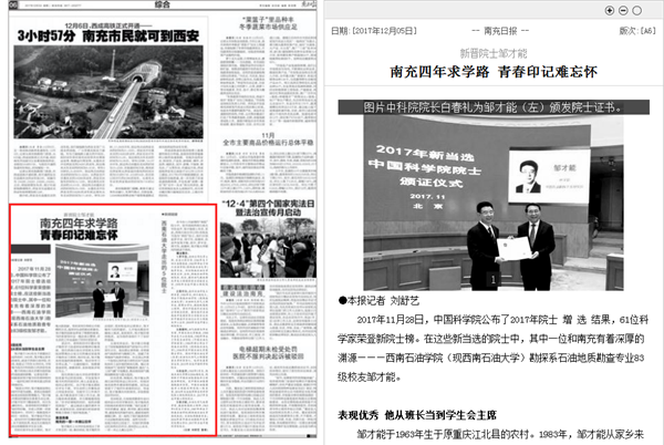 12月5日,南充日報以《新晉院士鄒才能 南充四年求學路 青春印記難忘懷》為題大篇幅專題報道了我校鄒才能院士在南充校區四年的求學生涯。(周煊涵)