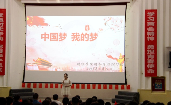財經學院財務管理2017級同學首先進行了“中國夢,我的夢”班會展示。主持人帶領大家重溫“中國夢”概念之后,其專業肖夢雪同學為大家帶來了《中國夢,我的夢》主題演講。接著是財管同學為大家帶來了一段青春洋溢的手指舞表演《為祖國點贊》,用時下最流行的方式展現出當代學子愛國報國的真摯情懷。班會主持人結合財務管理專業學習,引領全體同學立下“敢于做夢,勇于追夢,勤于圓夢”的志向,帶領現場全體師生一起合唱《追夢赤子心》,最后全場齊呼“為祖國加油,為民族爭氣”,將青年大學生的活力、斗志、赤子之心展現得淋漓盡致。