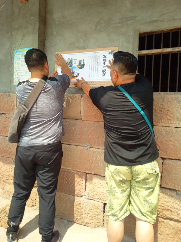黨員同志為脫貧戶張貼脫貧攻堅宣傳畫冊場景