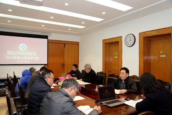 3月3日,南充校區黨委中心組舉行2021年第2次學習會,深入學習貫徹習近平總書記在黨史學習教育動員大會上的重要講話精神,貫徹落實黨中央、四川省委和學校黨委黨史學習教育動員會議要求。校長助理、南充校區黨委常務副書記張光君主持會議。南充校區領導趙剛、覃鴻飛、王勝軍、諶海云,黨政辦公室、黨群工作部(工會)有關同志參加學習。
