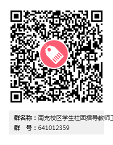為便于學(xué)生社團(tuán)指導(dǎo)教師開展工作,現(xiàn)已建立西南石油大學(xué)2020-2021學(xué)年學(xué)生社團(tuán)指導(dǎo)教師工作群,群號為:641012359,請各位指導(dǎo)教師掃碼進(jìn)群: