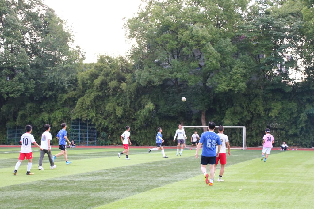 隨著一聲哨響,校區教工聯隊和各學院畢業生組成的聯隊,展開了激烈比拼。雙方配合默契,展示出不俗的實力,不斷打出精妙的配合和有威脅性的進攻,博得現場觀眾陣陣喝彩。開場不到10分鐘,畢業生聯隊同學一個完美的盤帶傳球,率先破門獲得1分。教工聯隊奮起追趕,憑借著豐富的經驗、優秀的個人能力,果斷變換陣形,傳球干擾學生聯隊,一記精彩的遠射扳平比分,再次點燃了全場激情。賽場上,雙方隊員精湛的腳法、完美的盤帶、犀利的射門以及精彩的配合,讓現場觀眾應接不暇。