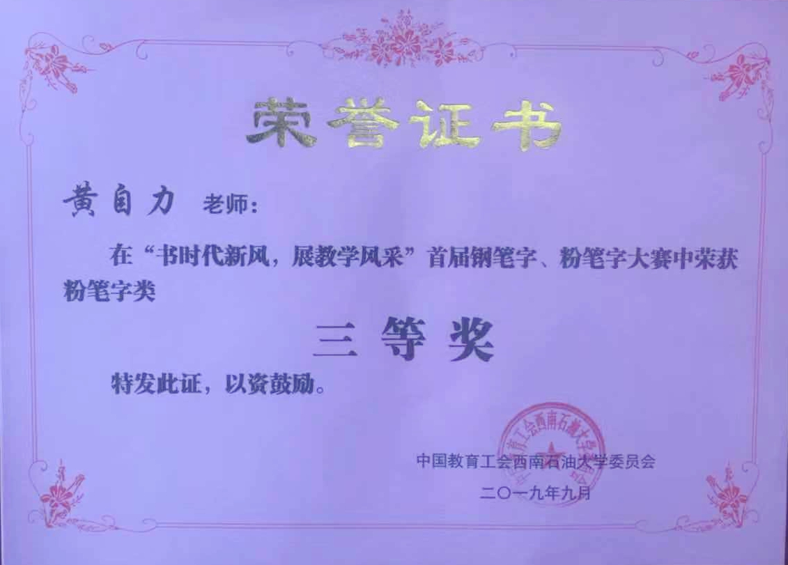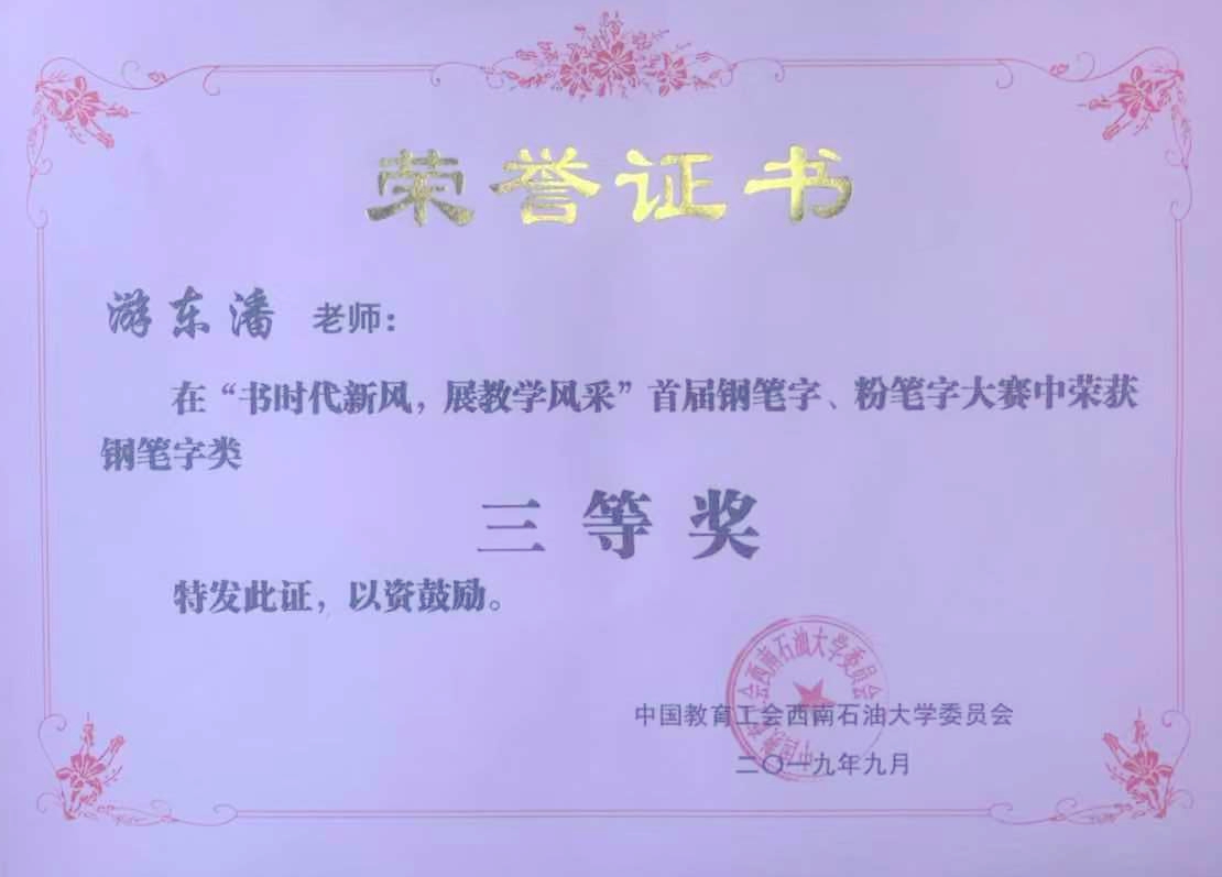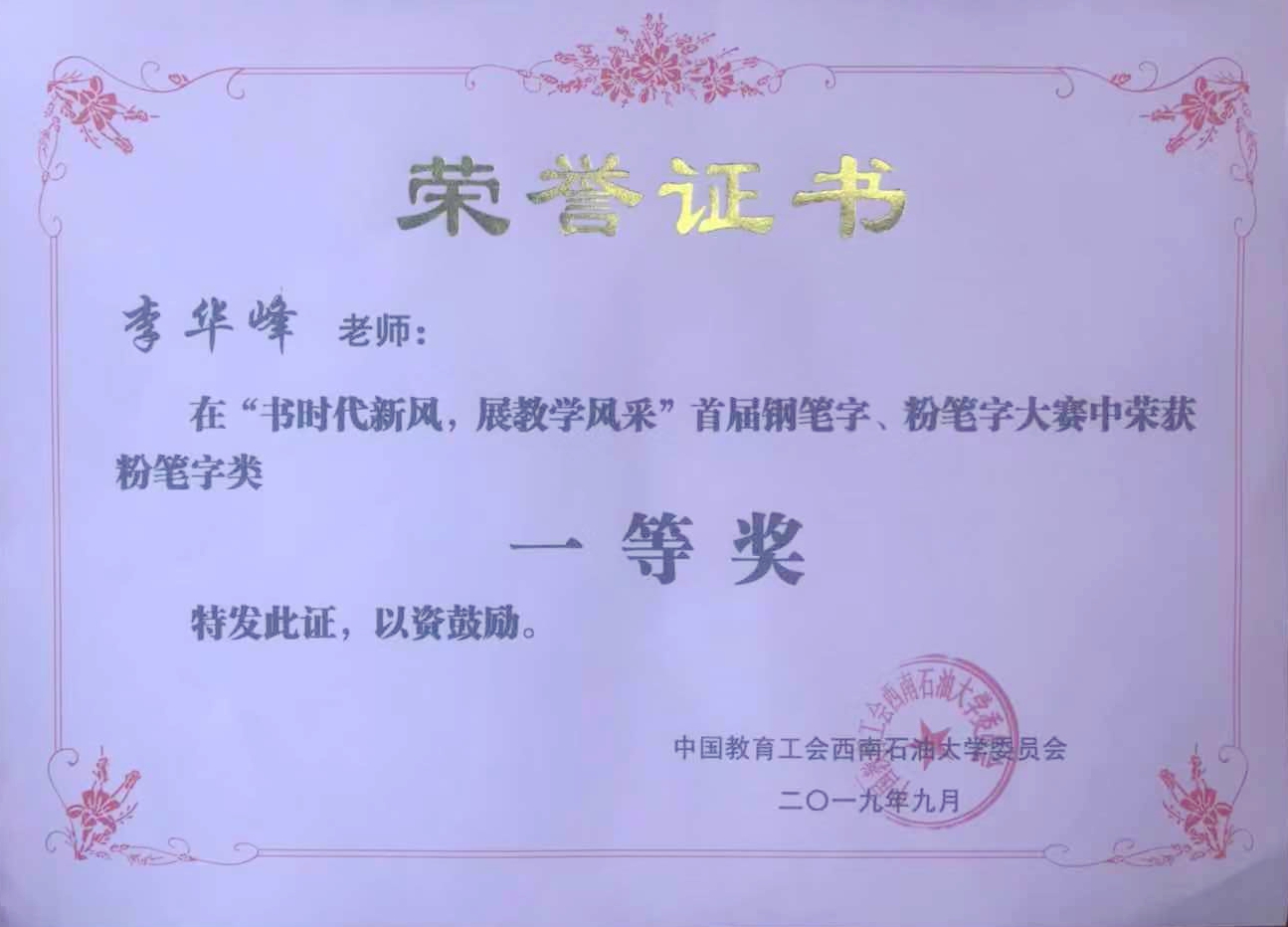 近日,學校工會舉辦了“書時代新風,展教學風采”首屆教職工鋼筆字、粉筆字大賽,南充校區(qū)李華鋒老師榮獲教職工粉筆字比賽一等獎,黃自力老師榮獲教職工粉筆字比賽三等獎,劉軍華、游東潘老師榮獲教職工鋼筆字比賽三等獎。
