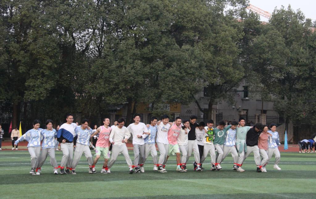 比賽開始前,同學們熱情高漲。參賽人員做好準備活動,與隊友們互相打氣,商量比賽策略。比賽進行時,同學們奮勇前進。20名隊員手挽手,腳綁腳站在起跑線上蓄勢待發,號令一響,大家步調一致,口號整齊,一步一步向前進。場外,觀眾加油吶喊聲此起彼伏,迅速點燃比賽氣氛。同學們相互幫助,相互扶持,有的隊伍盡管出現了小失誤,也毫不氣餒,扶起摔倒的隊員,迅速找回狀態后,奮起直追,爭分奪秒,最終成功到達終點。