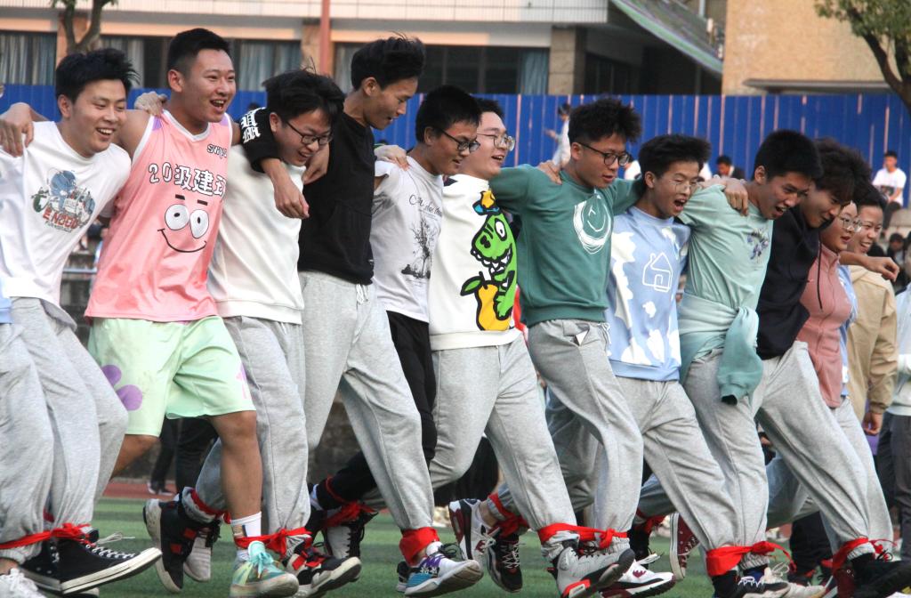 該比賽考驗的是同學們的身體協調能力和團隊合作意識。每名隊員將自己和左右兩邊隊員從腳踝處綁在一起,站成一排,聽到發令后所有人同時向前跑,計算最后一名同學過線的時間,用時短的隊伍獲勝。
