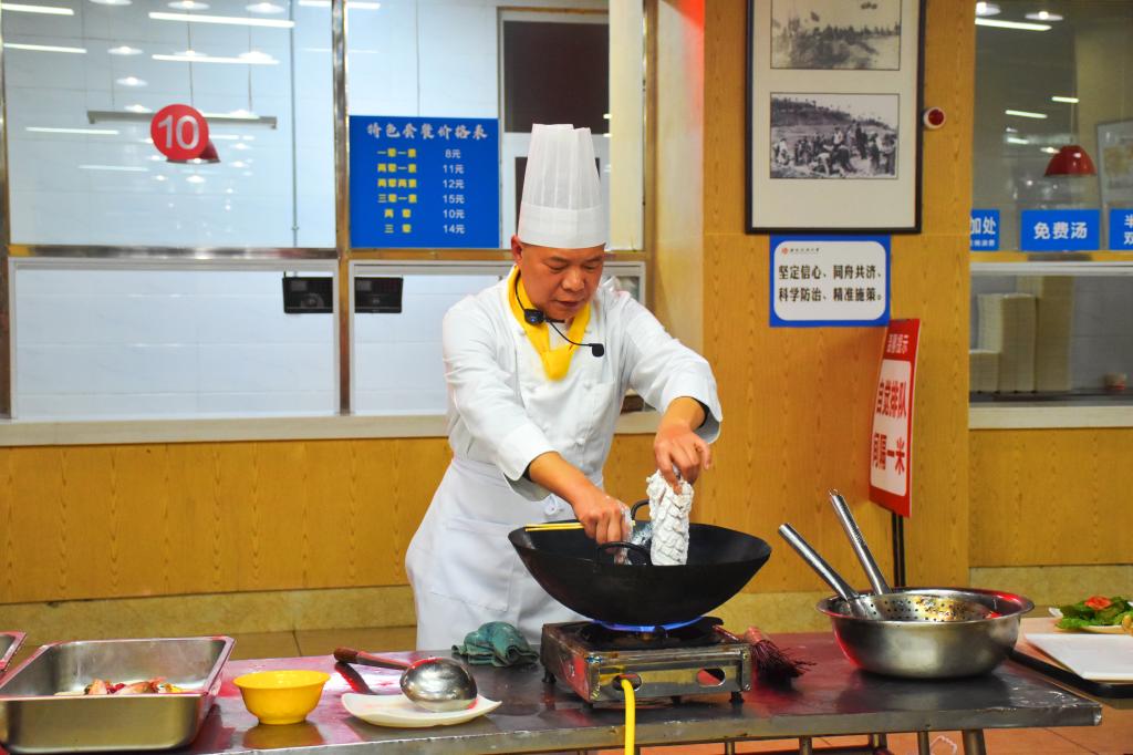 在學生食堂,謝君憲老師現場烹飪了西柚烤牛肉、麻婆豆腐、松鼠魚、茄汁葡萄魚、龍井魚米5道菜肴,講述了菜肴背后的故事。同學們認真聽講,對謝老師的高超廚藝嘖嘖稱贊,紛紛拿出手機拍照留影,現場氣氛熱烈。