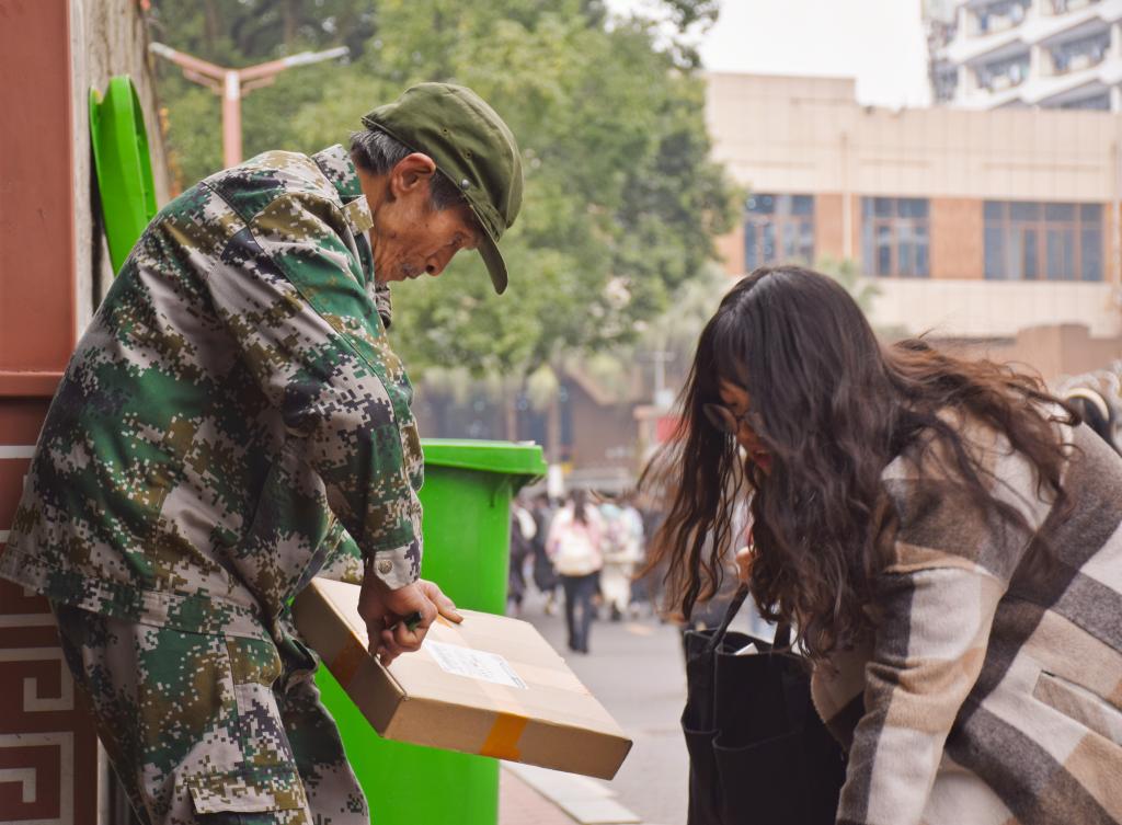 “爺爺,可以幫我開一下這個箱子嗎?”“奶奶,紙箱給您!”在校園菜鳥驛站旁,接過快遞盒的兩位老人,面容慈祥地對每位同學(xué)說謝謝。