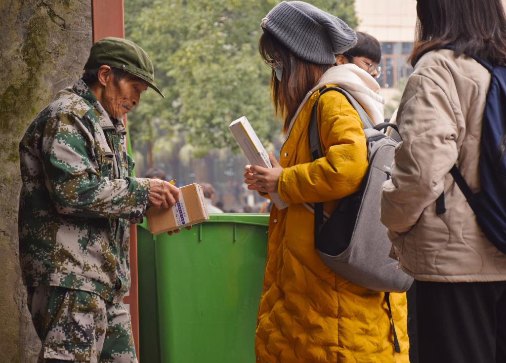 起初,小柚子們就注意到了這兩位老人,他們只是守在那里,默默無聞地拾起同學(xué)們丟在垃圾桶里的紙盒。后來,同學(xué)們主動遞上需要拆的快遞,老人用小刀輕輕劃開快遞上的膠帶,再將快遞盒遞給同學(xué),在一旁靜靜地等待空盒,將其展開、折疊,放入一旁的編織袋中。兩位老人不求不搶,不卑不亢,就像他們站處身旁的那棵老樹,滄桑卻不失沉穩(wěn)。