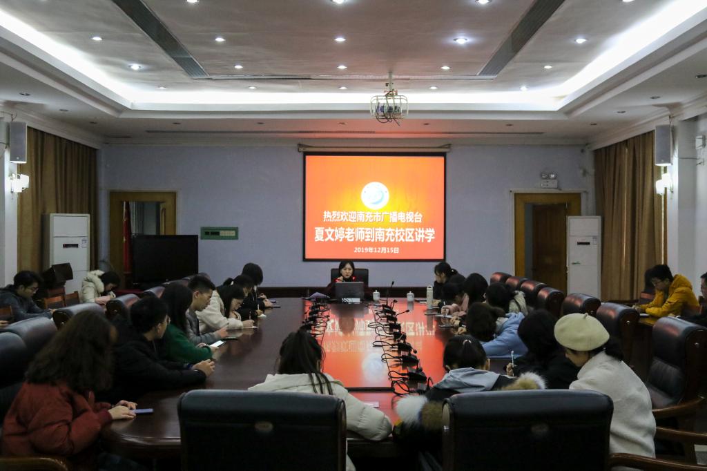 12月15日,南充市廣播電視臺夏文婷老師應邀到南充校區,為校區大學生全媒體中心的學生記者作了播音主持培訓。