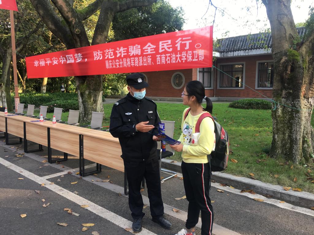 11月6日下午,保衛(wèi)部聯(lián)合順慶公安分局將軍路派出所在南充校區(qū)開(kāi)展了“反電信詐騙”宣傳教育活動(dòng)。保衛(wèi)部治安科科長(zhǎng)蒲和平,順慶將軍路派出所派出所副所長(zhǎng)賈曉明參加了本次活動(dòng)。