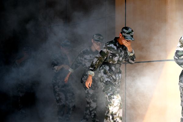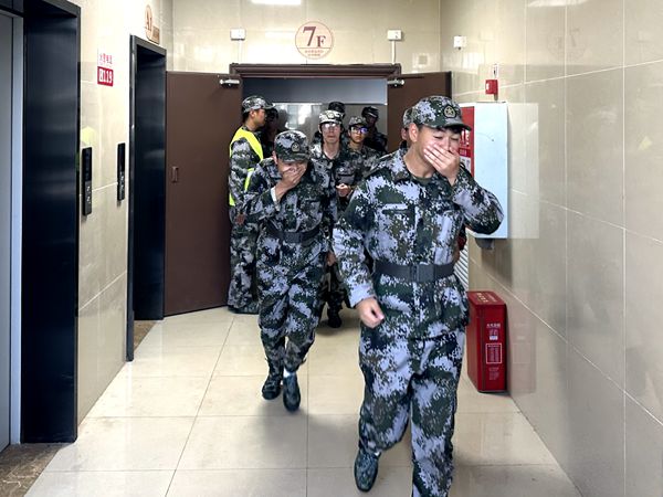 伴隨著急促的哨聲及燃起的煙霧,演練正式開始。各樓層教官和疏散引導員迅速行動,組織同學們緊急疏散,在教官和疏散引導員的指揮下,同學們捂住口鼻,低頭彎腰,按照演練預設路線規范、有序撤離,各樓層疏散引導員清點無人員遺漏后迅速撤離,快速奔向田徑運動場避險。抵達田徑運動場后,各連隊指導員迅速清點人數,確認無人員受傷后,向總指揮匯報。總指揮對此次消防演練作了點評。