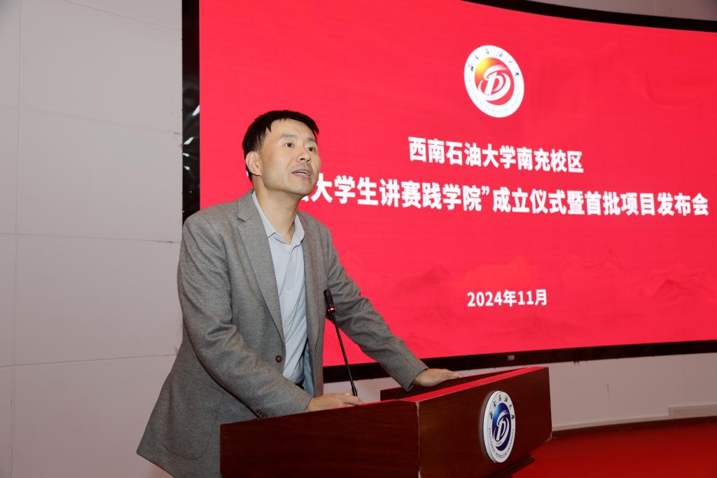 為學習貫徹習近平總書記關于青年成長成才重要論述,扎實推進立德樹人根本任務,落實學校關于學生“講·賽·踐”專項活動部署要求,11月14日,南充校區“自強大學生講賽踐學院”成立儀式暨首批項目發布會在國際學術交流中心舉行。南充校區黨委副書記、常務副校長姚遠出席活動并致辭,黨委副書記郝江嶺為學院及各分院授牌。學生發展部(團委)、各學院學生工作辦公室相關負責人參加成立儀式。