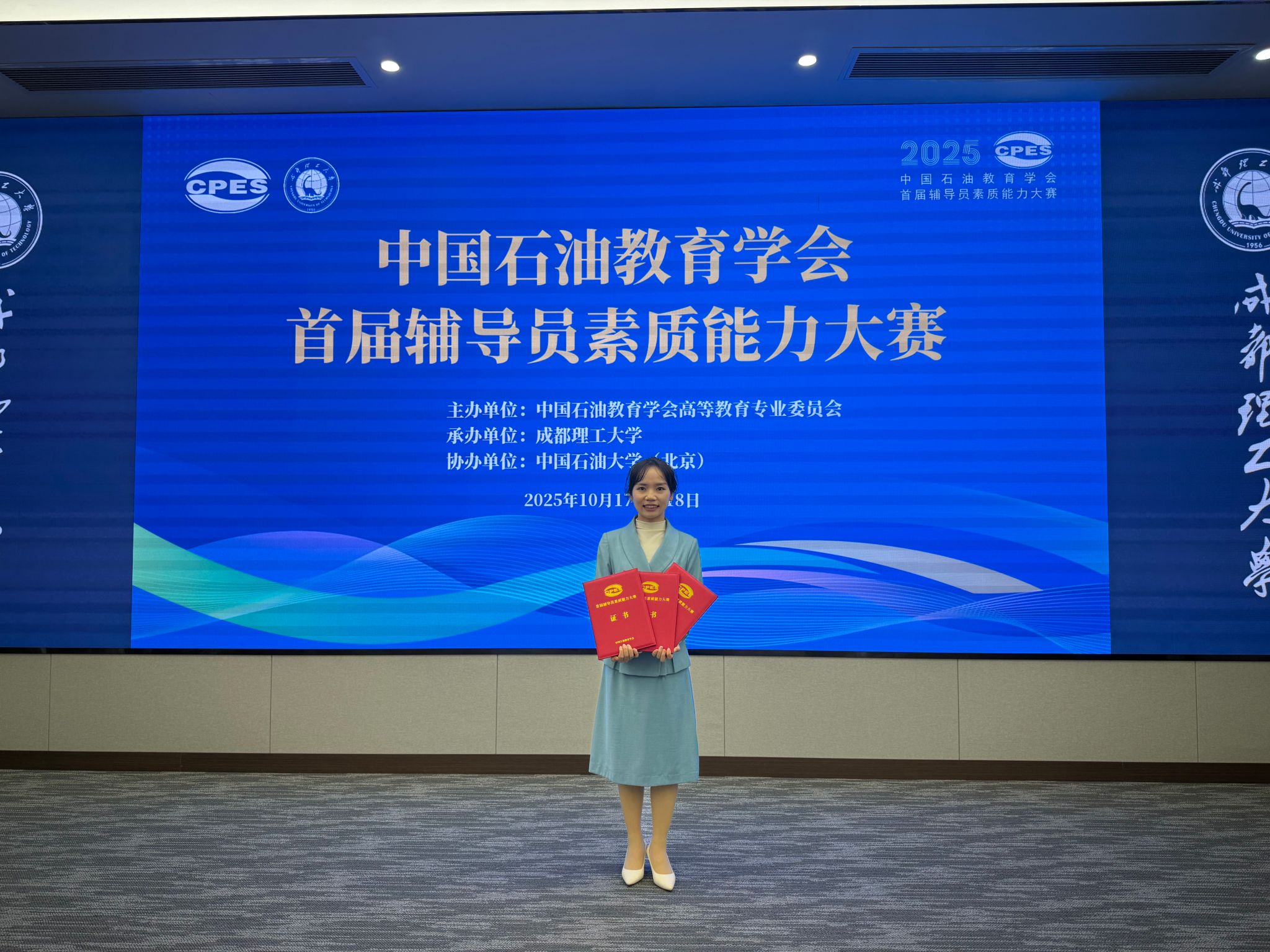 10月16日至17日,首屆中國石油教育學會輔導員素質能力大賽在成都理工大學舉辦,南充校區輔導員、理學院學生工作辦公室(團總支)主任薛靜榮獲特等獎。