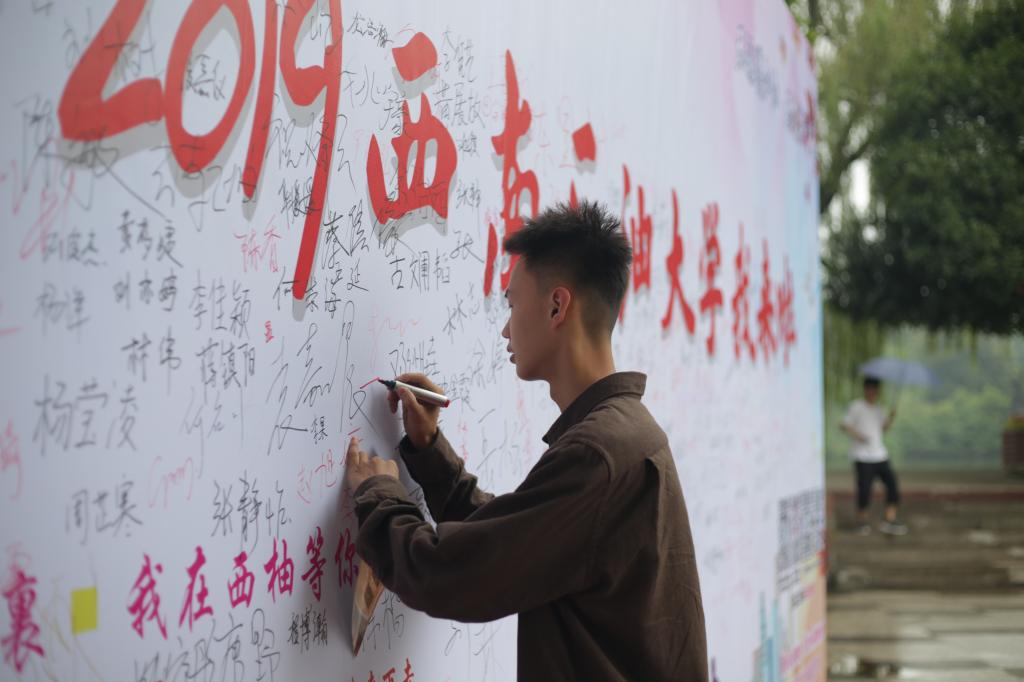 校區在龍井湖觀景平臺上擺放了“WELCOME TO SWPU”主題合影墻。合影墻包含了磕頭機、井架等石油文化元素,并與美麗的龍井湖景色巧妙地結合在一起,吸引了許多新生和家長紛紛前來合影留戀。在體育館門前設置了印有學校Logo、石大精神等內容的巨幅新生簽名留影墻,讓新生留下自己入學時的最美的記憶,受到了新生的歡迎,紛紛在簽名墻上留下屬于自己的印記,在合影墻前拍下“我”與石大的第一張合影,定格下入學時的青春瞬間。體育館報到點,新生和家長正駐足觀看大學生全媒體中心播放的學校宣傳片、校園風景視頻、央視科教頻道采訪校區學子的草莓采摘器專題片,新生及家長紛紛點贊校區的建設發展、辦學實力和人才培養成果。