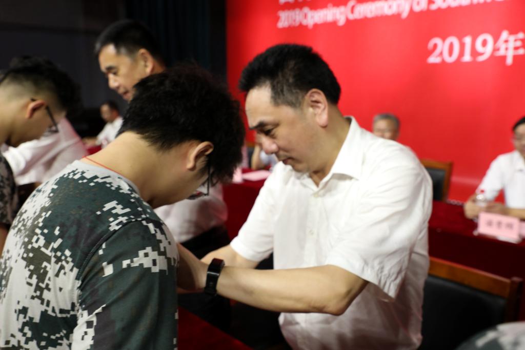 校長(zhǎng)助理、南充校區(qū)黨委常務(wù)副書記張光君為新生代表佩戴校徽