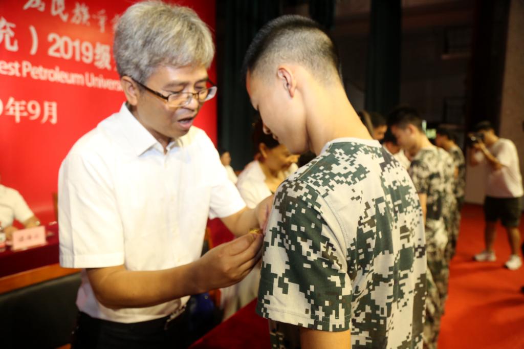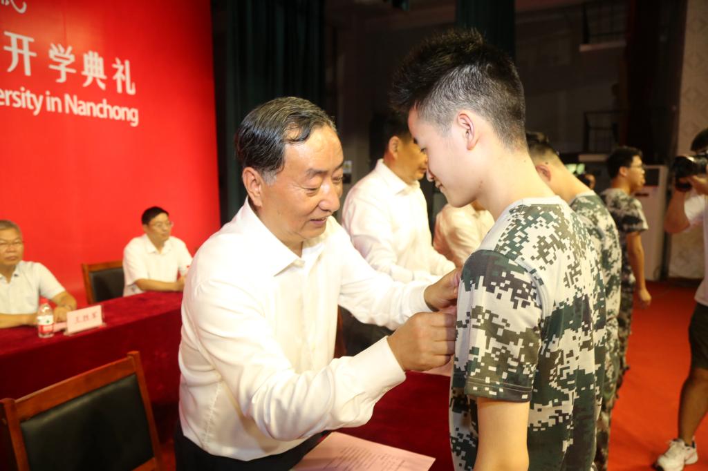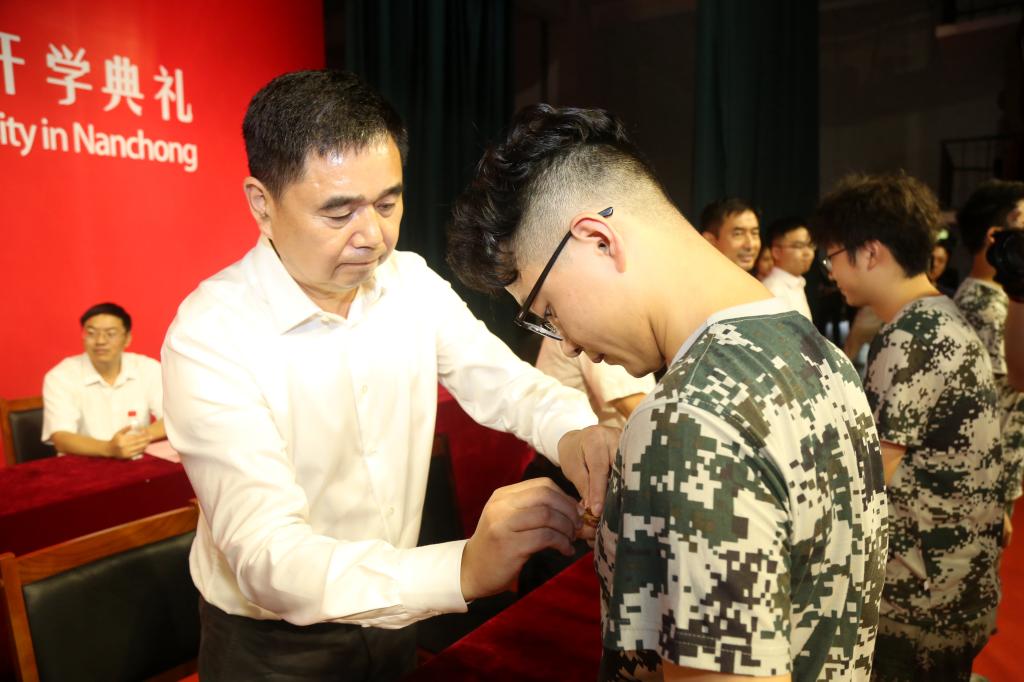 校黨委常委、副校長(zhǎng)兼南充校區(qū)黨委書記張文衛(wèi)為新生代表佩戴校徽