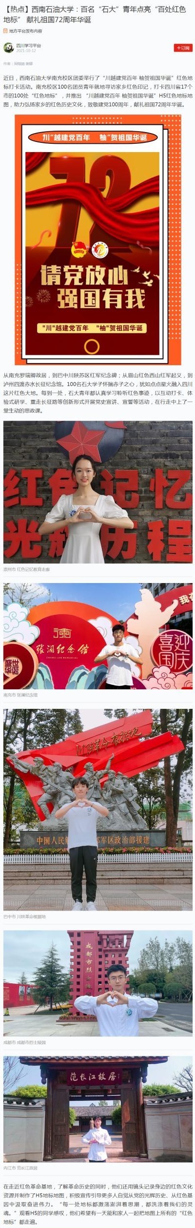 近日,西南石油大學南充校區團委舉行了“川越建黨百年 柚賀祖國華誕”紅色地標打卡活動。南充校區100名團員青年就地尋訪家鄉紅色印記,打卡四川省17個市的100處“紅色地標”,并推出 “川越建黨百年 柚賀祖國華誕”H5紅色地標地圖,助力弘揚家鄉的紅色歷史文化,致敬建黨100周年,獻禮祖國72年華誕。