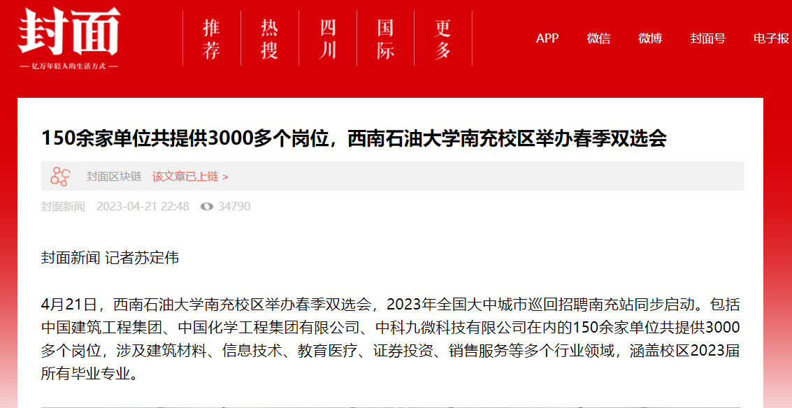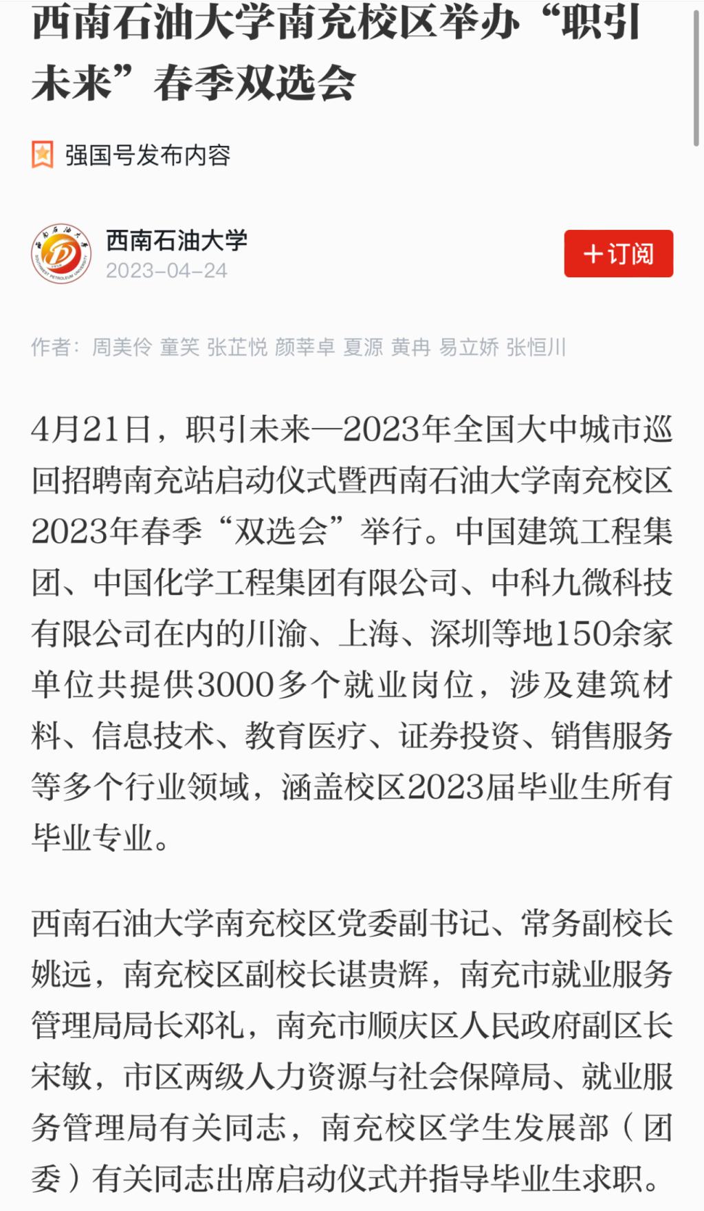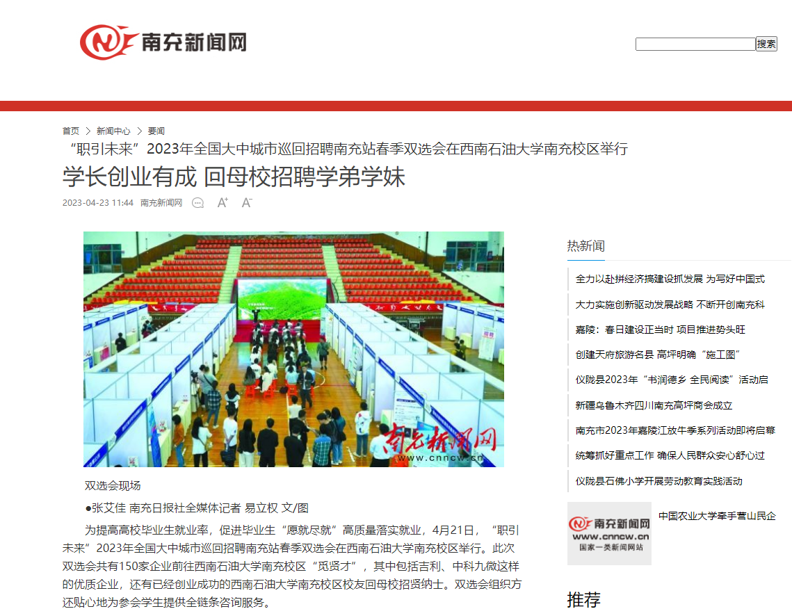 南充日?qǐng)?bào)以《學(xué)長創(chuàng)業(yè)有成回母校招聘學(xué)弟學(xué)妹》為題開展了相關(guān)報(bào)道。學(xué)習(xí)強(qiáng)國APP以《西南石油大學(xué)南充校區(qū)舉辦“職引未來”春季雙選會(huì)》為題開展了相關(guān)報(bào)道。封面新聞以《150余家單位共提供3000多個(gè)崗位,西南石油大學(xué)南充校區(qū)舉辦春季雙選會(huì)》為題開展了相關(guān)報(bào)道。今日順慶以《政校攜手舉辦“雙選會(huì)”3000多個(gè)崗位“隨便挑”》為題開展了相關(guān)報(bào)道。