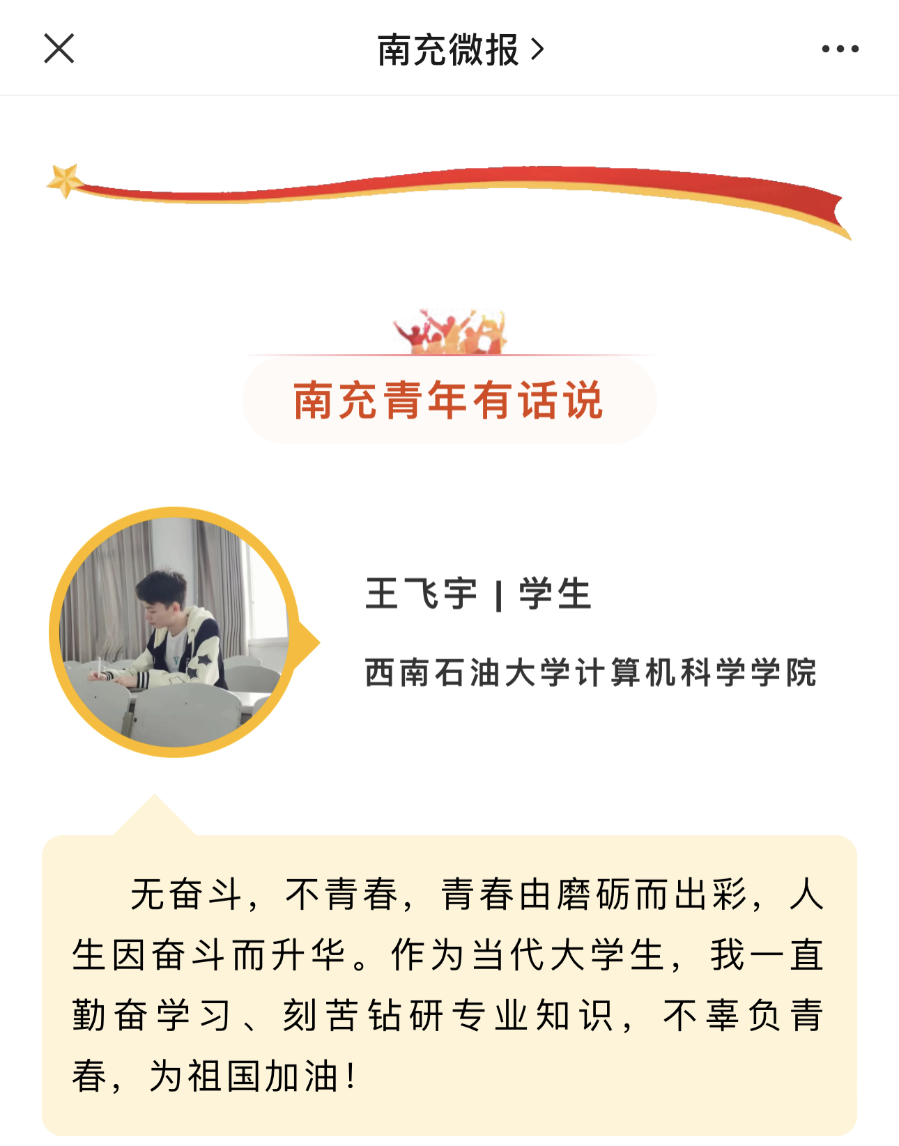 采訪結(jié)束后,王飛宇表示十分榮幸能作為南充駐市高校學(xué)生代表接受采訪,他說:“無奮斗,不青春,青春由磨礪而出彩,人生因奮斗而升華。當(dāng)代青年大學(xué)生,正處在實現(xiàn)第二個百年奮斗目標(biāo)的關(guān)鍵時期,民族復(fù)興重任在肩,我將勤奮學(xué)習(xí)、刻苦鉆研專業(yè)知識,將自己的小我融入到國家的大我之中,為祖國加油,為民族爭氣!”(文/沈靖雯)