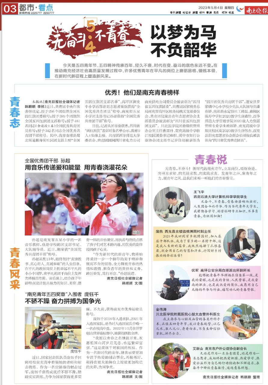 該采訪報道分別刊登在南充晚報微報紙第6725期03版“青春說”欄目和南充微報《南充青年:不一樣的青春一樣的精彩》,王飛宇通過采訪展現(xiàn)了當(dāng)代大學(xué)生以奮斗出彩、爭做新時代奮斗青年的精神面貌。