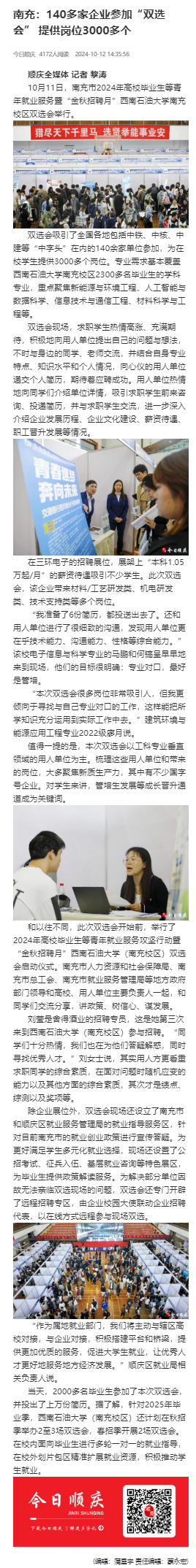 2024年10月11日,四川省南充市組織的2024年高校畢業生等青年就業服務暨“金秋招聘月”西南石油大學南充校區雙選會正在火熱進行,大學畢業生們踴躍投遞簡歷,選擇一份合適的工作。