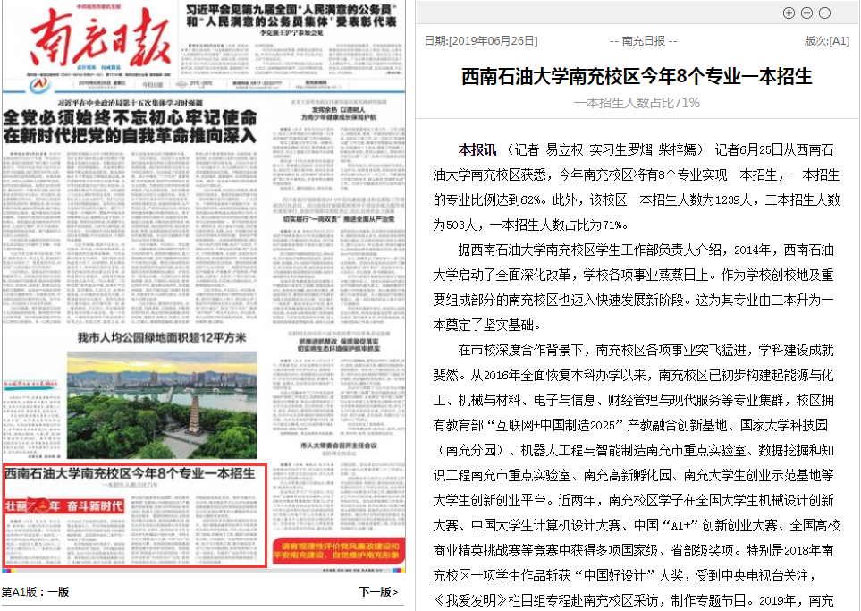6月26日,南充日報頭版重點報道南充校區今年8個專業一本招生。