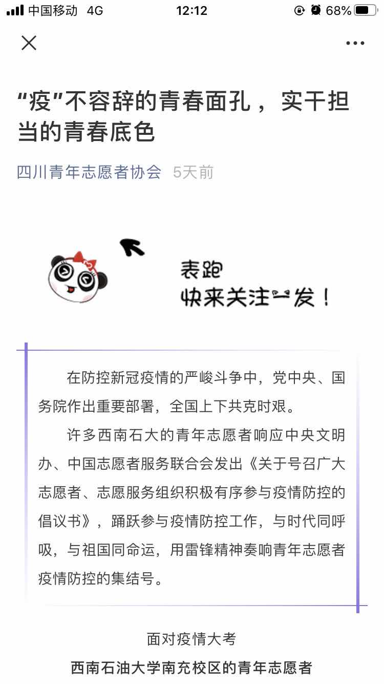 3月27日,中國青年志愿者協會官方微信公眾號、四川青年志愿者協會官方微信公眾號以《“疫”不容辭的青春面孔 ,實干擔當的青春底色》為題,重點報道了南充校區青年大學生參加家鄉疫情防控志愿服務。