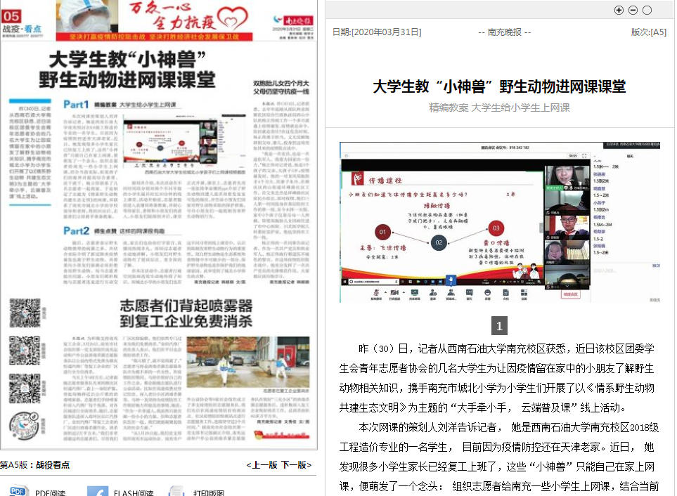 3月31日,南充晚報在“戰疫·看點”專欄大篇幅重點報道南充校區大學生青年志愿者為南充市城北小學的小學生們開設了主題為《情系野生動物 共建生態文明》的“大手牽小手, 云端普及課”線上活動。